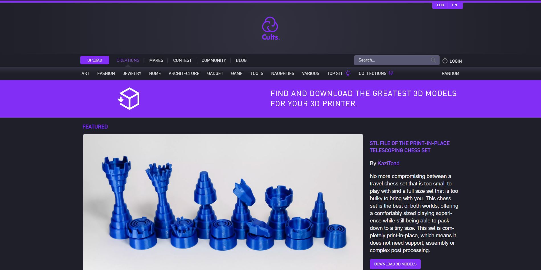 Cults 3D is a provider of 3D models for designers and artists. Cults offers its users the perfect range from maker-inspired files all the way to professional high quality designs, with each design being checked for printability before it’s organized into different groups such as fashion art jewelry home architecture gadgets, etc.