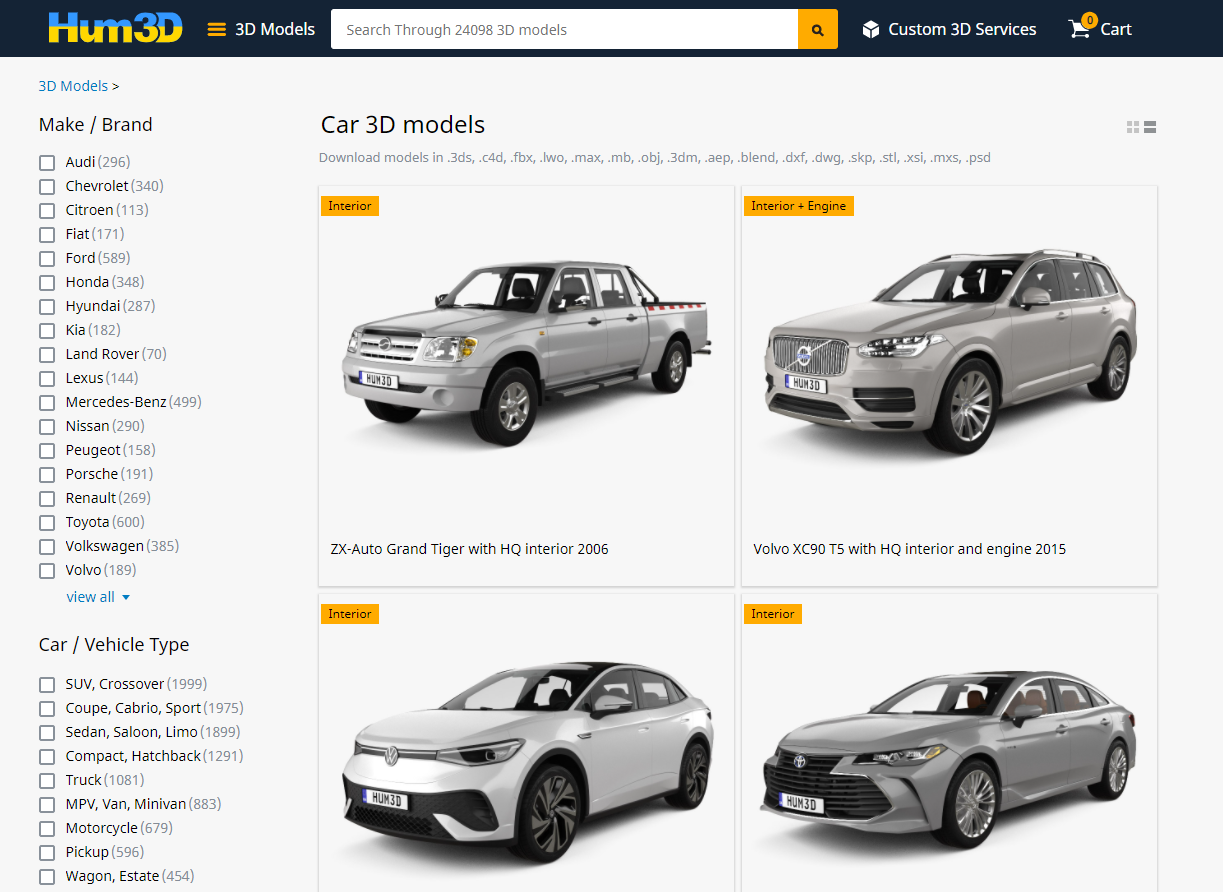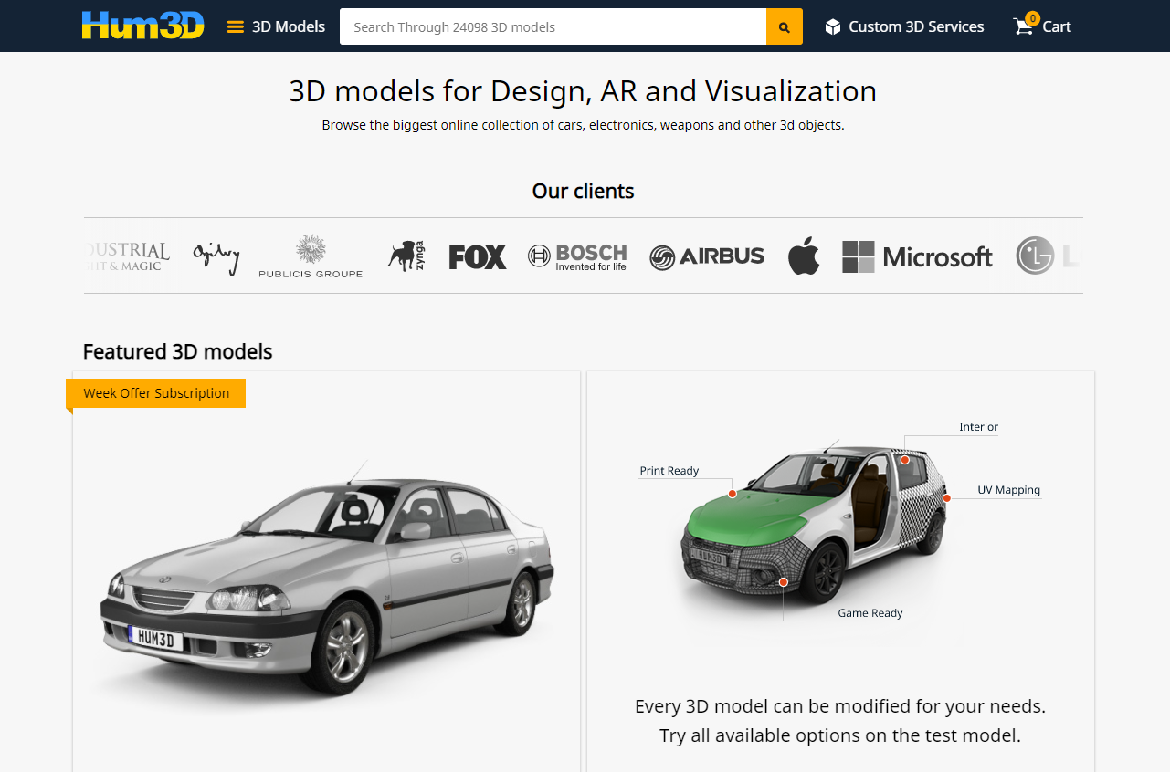 The Hum3D team of 3D artists for more than 15 years has created a large collection of high-quality 3D models. Among professional visualizers, Hum3D is widely known for its collection of car 3D models. It has more than 9000 unique models, many of which you will not find on other websites.